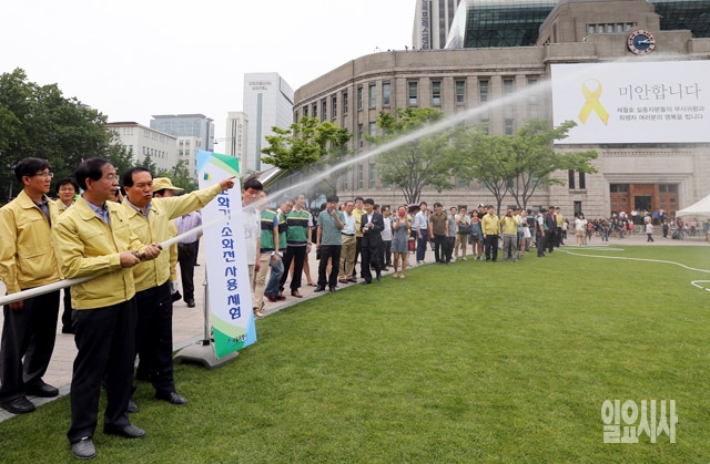 제394차 민방위훈련이 실시된 20일 서울시청에서 박원순 서울시장이 소화전 사용체험을 하고 있다.