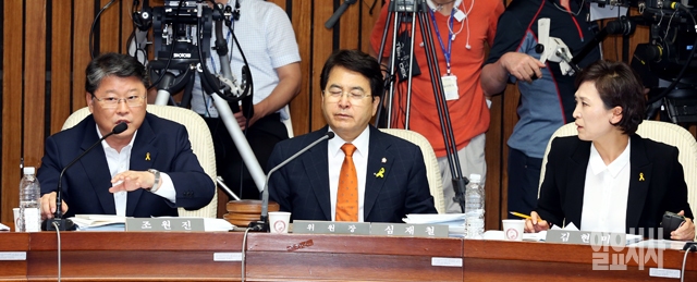 2일 서울 여의도 국회에서 열린 세월호침몰사고진상규명국정조사 특별위원회 전체회의에서 심재철 위원장(가운데)이 조원진 여당간사(왼쪽)와 김현미 야당간사의 발언을 듣고 있다.