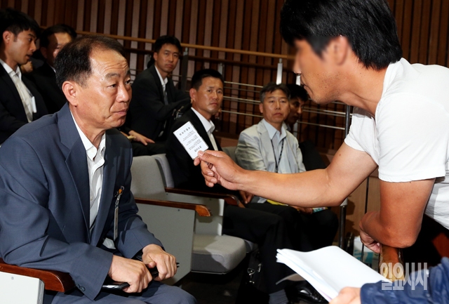 2일 서울 여의도 국회에서 열린 세월호침몰사고진상규명국정조사 특별위원회 전체회의가 중지된 후 세월호 유가족이 관계자에게 항의를 하고 있다.