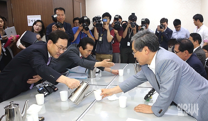 여야 정책위의장단이 2일, 서울 여의도 국회 의원회관에서 첫 주례회동을 가진 가운데, 나성린 새누리당 정책위수석부의장·주호영 정책위의장(사진 왼쪽)이 우윤근 새정치민주연합 정책위의장(사진 오른쪽) 등에게 서로 물을 따라주고 있다.