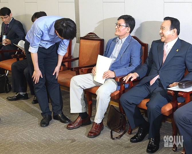 새누리당 이준석 혁신위원장(29)이 2일, 국회 의원회관에서 쇄신전대추진모임 주최로 열린 '긴급토론! 7·14전당대회 쇄신과 새누리당의 미래'에서 이완구 비대위원장 겸 원내대표에게 인사하고 있다.