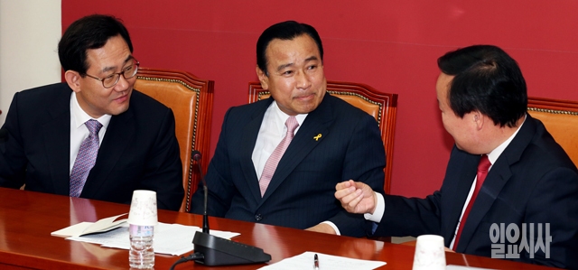이완구 새누리당 원내대표(가운데)가 2일 서울 여의도 국회에서 열린 원내대책회의에서 주호영 정책위의장(왼쪽), 김재원 원내수석부대표와 대화하고 있다.