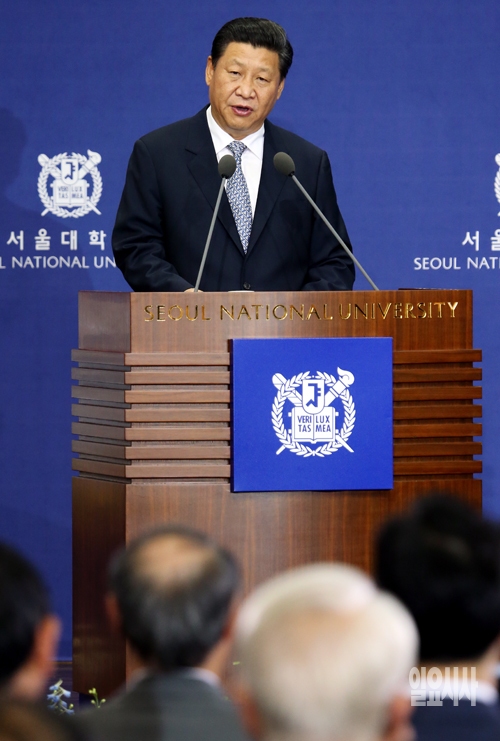 시진핑 중국 국가주석이 4일 서울대학교 글로벌공학교육센터에서 한중 우호 관계와 동북아 협력에 관한 강연을 하고 있다.