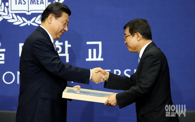 시진핑 중국 국가주석(왼쪽)이 4일 서울대학교 글로벌공학교육센터에서 한중 우호 관계와 동북아 협력에 관한 강연을 마친 뒤 오연천 총장에게 선물을 받으며 악수하고 있다.
