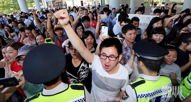 시진핑 중국 국가주석이 4일 서울대학교 글로벌공학교육센터에서 한중 우호 관계와 동북아 협력에 관한 강연을 마치고 밖으로 나오자 중국인 유학생들이 환호하고 있다.