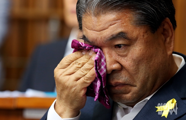 이재정 경기도 교육감이 4일 서울 여의도 국회에서 열린 세월호침몰사고진상규명국정조사 특별위원회 전체회의에서 눈물을 닦고 있다.