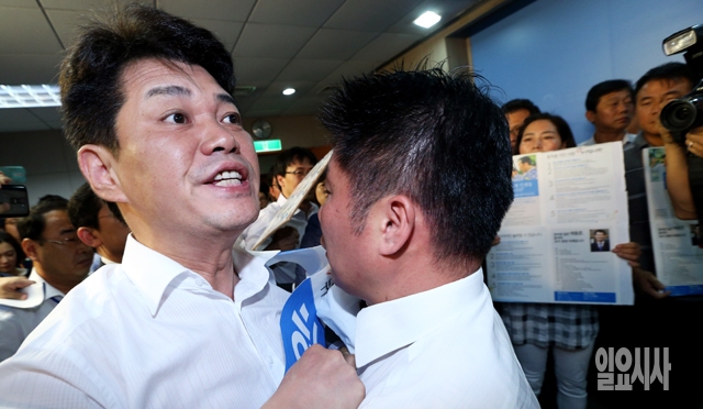 허동준 전 동작을 지역위원장이 8일 서울 여의도 국회 정론관에서 열린 기동민 전 서울시 정무부시장의 출마기자회견에 난입해 당 전략공천에 불만을 토로하고 있다.