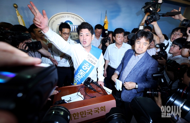 허동준 전 동작을 지역위원장이 8일 서울 여의도 국회 정론관에서 열린 기동민 전 서울시 정무부시장의 출마기자회견에 난입해 당 전략공천에 불만을 토로하고 있다.