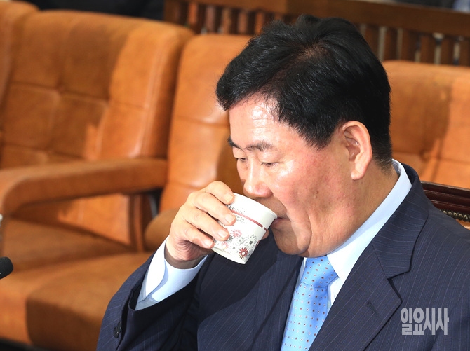 8일, 서울 여의도 국회에서 열린 최경환 경제부총리 겸 기획재정부 장관 후보자에 대한 인사청문회에서 최 후보자가 목이 타는 듯 물을 마시고 있다.