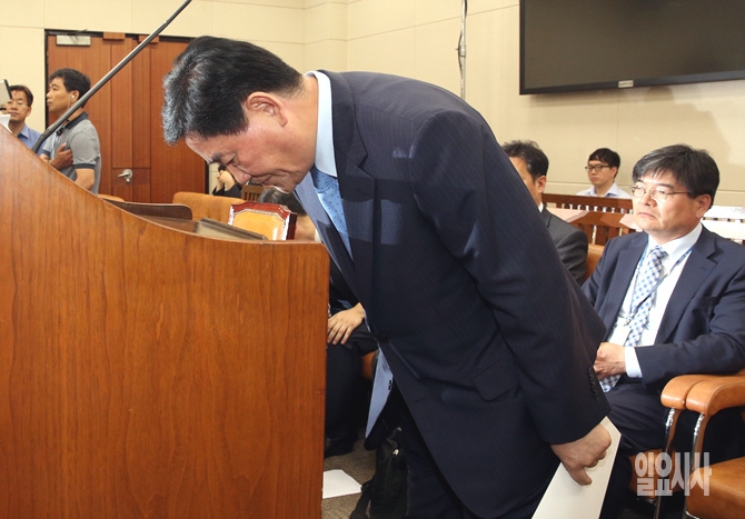 8일, 서울 여의도 국회에서 열린 최경환 경제부총리 겸 기획재정부 장관 후보자에 대한 인사청문회 직전, 최 후보자가 의원들을 향해 인사하고 있다.