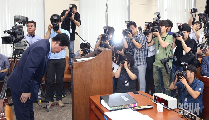 8일, 서울 여의도 국회에서 열린 최경환 경제부총리 겸 기획재정부 장관 후보자에 대한 인사청문회 직전, 최 후보자가 의원들을 향해 인사하고 있다.