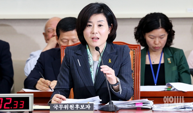 김희정 여성가족부 장관 후보자가 8일 서울 여의도 국회 여성가족위원회에서 열린 인사청문회에서 의원들의 질의에 답하고 있다.