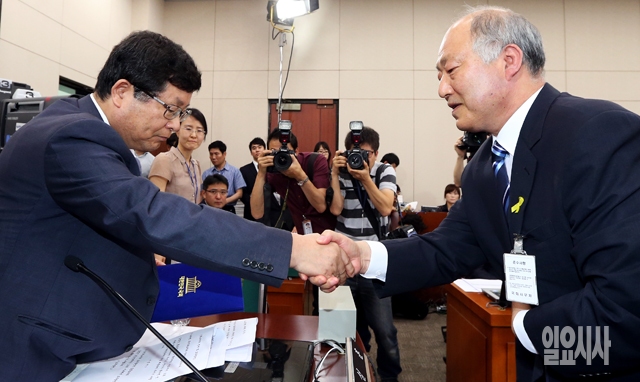 김명수 사회부총리 겸 교육부 장관 후보자(오른쪽)가 9일 서울 여의도 국회 교육문화체육관광위원회에서 열린 인사청문회에서 설훈 위원장과 악수하고 있다.