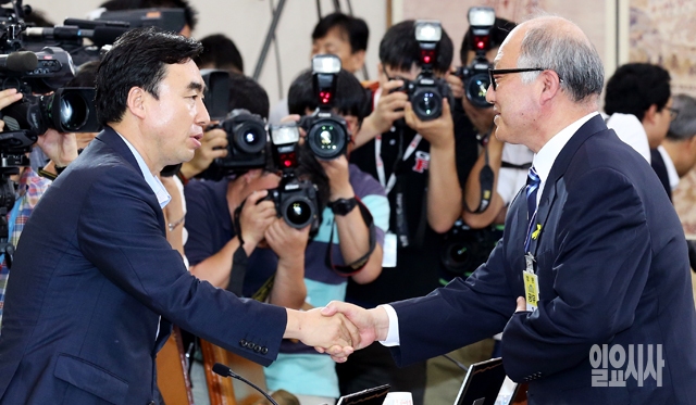 김명수 사회부총리 겸 교육부 장관 후보자(오른쪽)가 9일 서울 여의도 국회 교육문화체육관광위원회에서 열린 인사청문회에 참석, 윤관석 새정치민주연합 의원과 인사를 나누고 있다.
