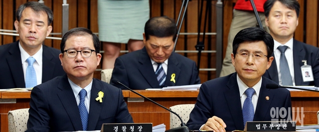 황교안 법무부 장관(오른쪽)과 이성한 경찰청장이 9일 서울 여의도 국회에서 열린 세월호침몰사고진상규명국정조사 특별위원회 전체회의에서 의원들의 질의를 경청하고 있다.