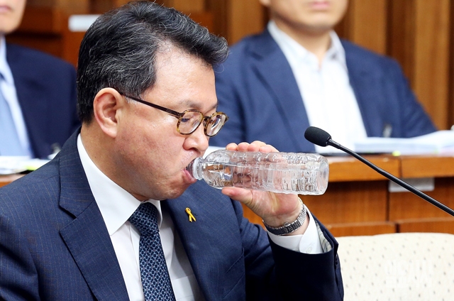 김영호 감사원 사무총장이 9일 서울 여의도 국회에서 열린 세월호침몰사고진상규명국정조사 특별위원회 전체회의에서 물을 마시고 있다.