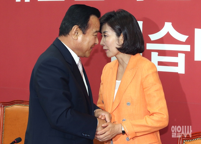 9일, 7·30 재보궐선거에 서울 동작을 출마를 권유받고 있는 새누리당 나경원 전 최고위원이 국회 원내대표실에서 이완구 원내대표와 악수를 나누고 있다.