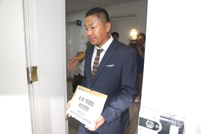 세월호 가족대책위원회 김병권 대표가 9일, 여의도 국회 민원실에서 이른바 4.16특별법을 제출하고 있다.