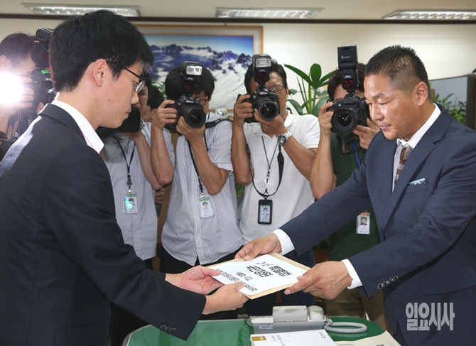 세월호 가족대책위 김병권 대표가 9일, 여의도 국회 민원실에서 4.16특별법안을 제출하고 있다.