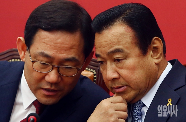새누리당 이완구 원내대표(오른쪽)와 주호영 정책위의장이 10일 서울 여의도 국회에서 열린 비상대책위원회의에서 논의하고 있다.