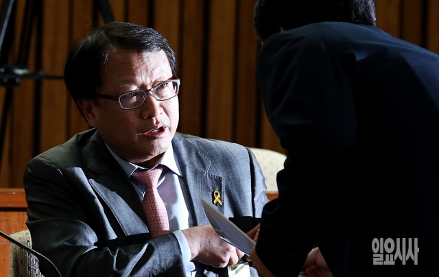 한기범 국가정보원 제1차장이 10일 서울 여의도 국회에서 열린 세월호침몰사고진상규명국정조사 특별위원회 전체회의에서 관계자와 대화하고 있다.