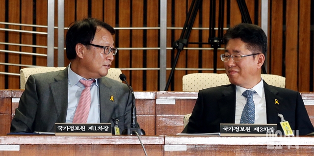 10일 서울 여의도 국회에서 열린 세월호침몰사고진상규명국정조사 특별위원회 전체회의에서 국가정보원 한기범 제1차장(왼쪽)과 김수민 제2차장이 대화하고 있다.