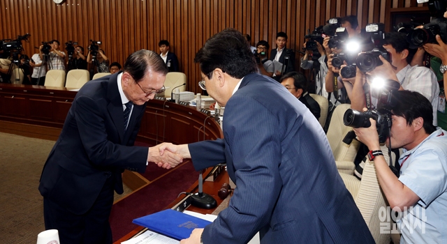 김기춘 청와대 대통령비서실장이 10일 서울 여의도 국회에서 세월호침몰사고진상규명국정조사 특별위원회 전체회의에서 심재철 위원장에게 선서문을 제출한 뒤 악수하고 있다.