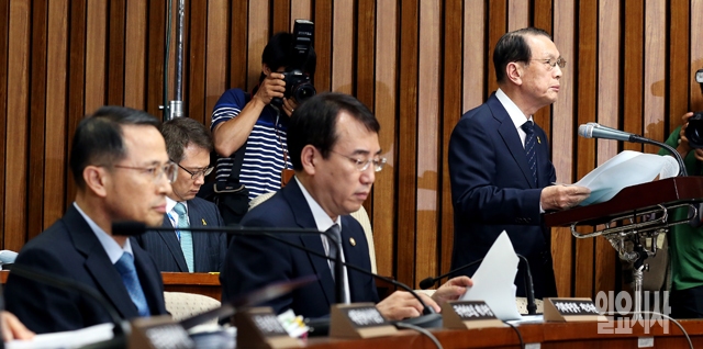 김기춘 청와대 대통령비서실장이 10일 서울 여의도 국회에서 세월호침몰사고진상규명국정조사 특별위원회 전체회의에서 기관보고를 하고 있다.