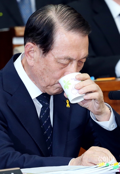 김기춘 청와대 대통령비서실장이 10일 서울 여의도 국회에서 세월호침몰사고진상규명국정조사 특별위원회 전체회의에서 물을 마시고 있다.