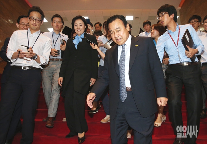 새누리당 이완구·새정치민주연합 박영선 원내대표가 10일, 서울 여의도 국회에서 박근혜 대통령과의 취임 첫 회동결과를 브리핑 후 이동하고 있다.