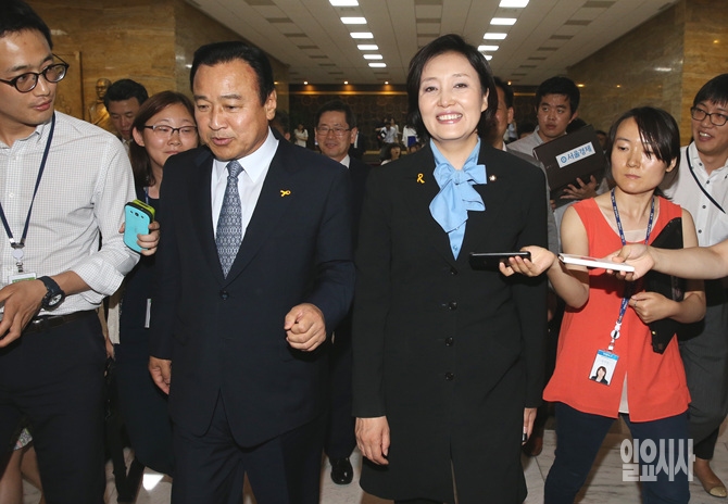 새누리당 이완구·새정치민주연합 박영선 원내대표가 10일, 서울 여의도 국회에서 박근혜 대통령과의 취임 첫 회동결과를 브리핑 후 이동하면서 웃음 짓고 있다.