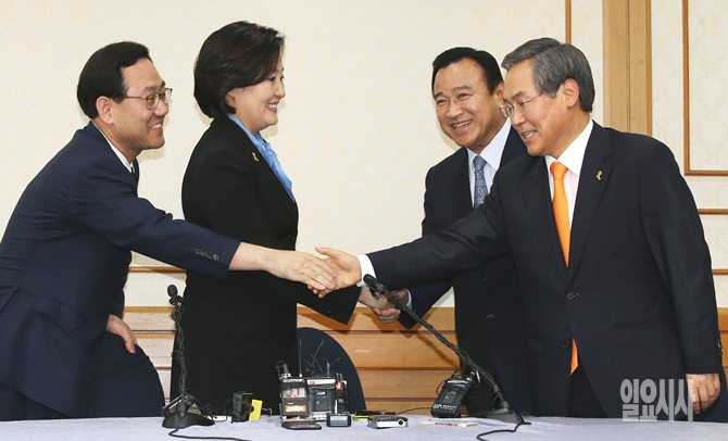 새누리당 주호영·새정치민주연합 우윤근 정책위의장이 10일, 서울 여의도 국회에서 박근혜 대통령과의 취임 첫 회동결과를 브리핑 직전, 악수를 고 있다.