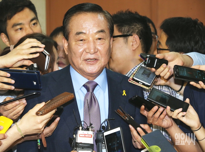 '새누리당 당권레이스'에 뛰어든 서청원 의원이 10일, 서울 여의도 국회정론관 새누리당 7·14 전당대회 관련 기자회견 직후, 취재진의 질문에 답변하고 있다.