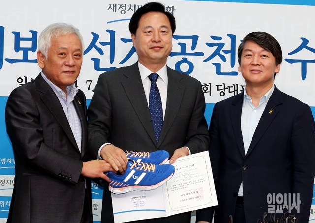 김한길(왼쪽), 안철수 새정치민주연합 공동대표와 김두관 경기 김포 후보(가운데)가 11일 서울 여의도 국회에서 열린  7·30 재보궐선거 공천장 수여식에서 기념촬영을 하고 있다.