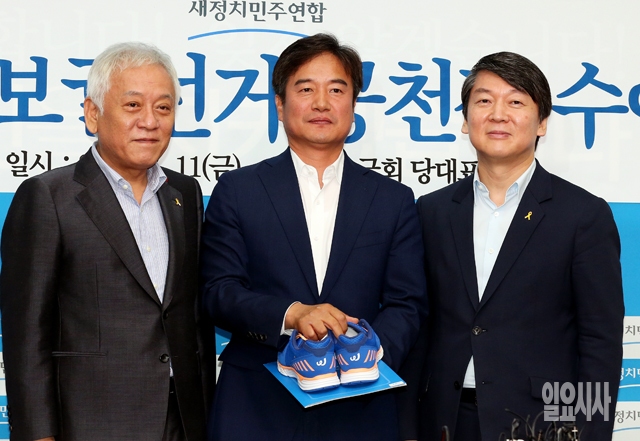 김한길(왼쪽), 안철수 새정치민주연합 공동대표와 조한기 충남 서산·태안 후보(가운데)가 11일 서울 여의도 국회에서 열린  7·30 재보궐선거 공천장 수여식에서 기념촬영을 하고 있다.