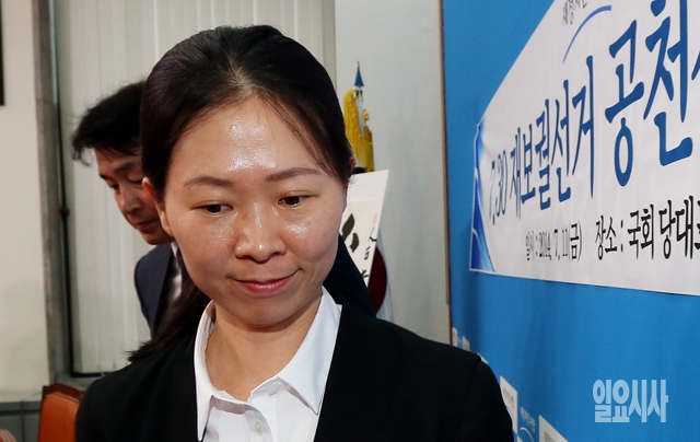 11일 서울 여의도 국회에서 열린 새정치민주연합 7·30 재보궐선거 공천장 수여식을 마친 권은희 광구 광산을 후보가 나서고 있다.