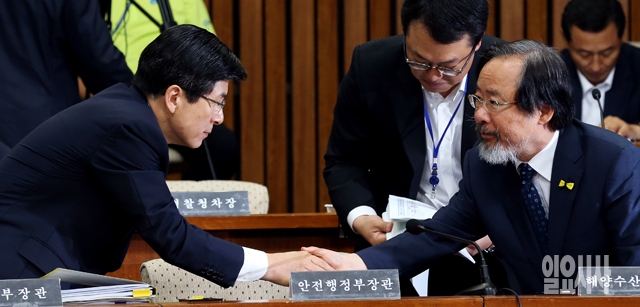 황교안 법무부 장관(왼쪽)과 이주영 해양수산부 장관이 11일 서울 여의도 국회에서 열린 세월호침몰사고진상규명국정조사 특별위원회 전체회의에서 악수하고 있다.