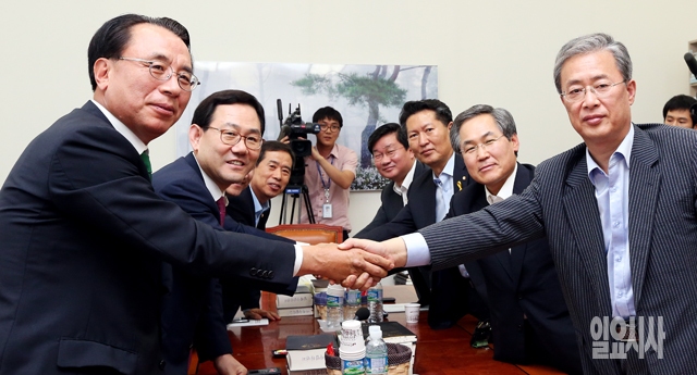 11일 서울 여의도 국회에서 세월호특별법 TF 1차회의가 열리고 있는 가운데 참석자들이 악수를 하고 있다. TF에는 법제사법위, 안전행정위, 농림축산식품해양수산위 등 세월호 참사 관련 상임위 여야 간사와 여야 정책위의장이 지명하는 법조인 출신 의원 등 8명이 참여한다.