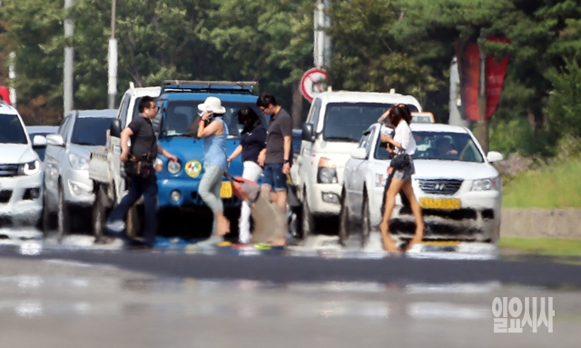서울 낮기온이 33도까지 오르는 찜통 더위가 이어지는 11일 서울 여의도의 한 도로가 뜨거운 열기로 인해 이글거리고 있다.