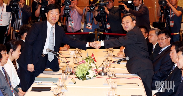 14일 서울 홍은동 그랜드힐튼호텔에서 열린 한·중 FTA 12차 협상에서 한국 측 수석대표 우태희 산업부 통상교섭실장(왼쪽)과 중국 측 수석대표 왕셔우원 상무부 부장조리가 협상에 앞서 악수를 하고 있다.