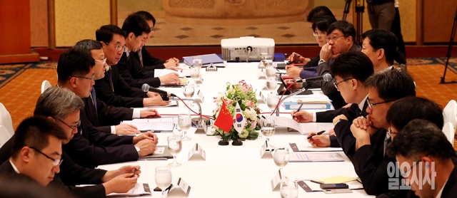 14일 서울 홍은동 그랜드힐튼호텔에서 열린 한·중 FTA 12차 협상에서 한국 측 수석대표 우태희 산업부 통상교섭실장과 중국 측 수석대표 왕셔우원 상무부 부장조리를 비롯한 참석자들이 협상을 하고 있다.