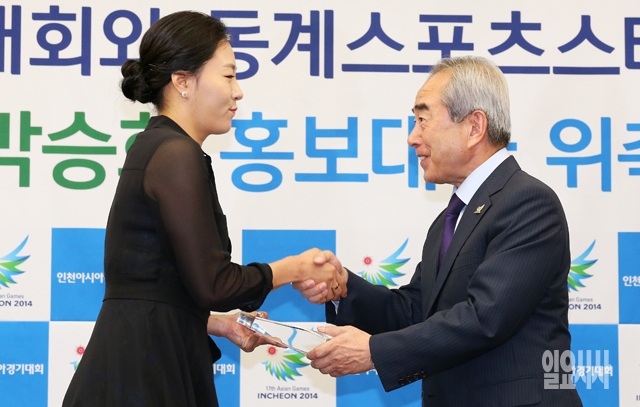 스피드스케이팅 이상화 선수(왼쪽)가 14일 서울 중구 프레스센터에서 열린 2014인천아시아경기대회 홍보대사 위촉식에서 김영수 조직위원장으로부터 위촉패를 받고 있다.