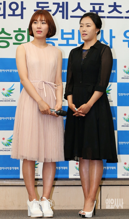 스피드스케이팅 이상화 선수(오른쪽)와 쇼트트택 박승희 선수가 14일 서울 중구 프레스센터에서 열린 2014인천아시아경기대회 홍보대사 위촉식에 참석해 있다.