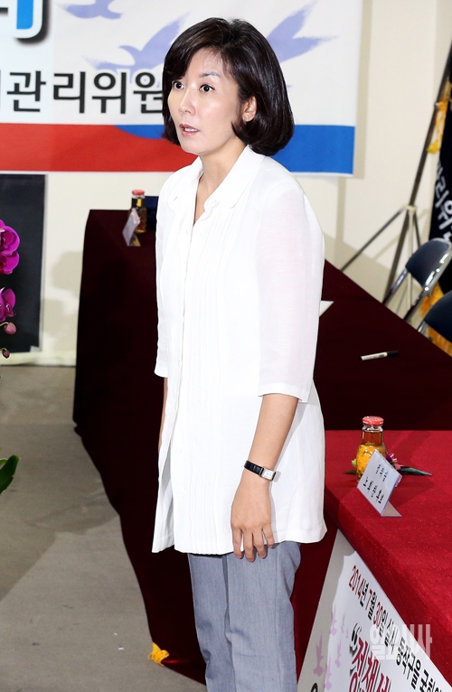 새누리당 나경원 동작을 후보가 14일 서울 동작구 선거관리위원회에서 열린 매니페스토 정책선거 실천 협약식에 참석하고 있다. 이날 나 후보는 전당대회로 인해 늦게 참석했다.