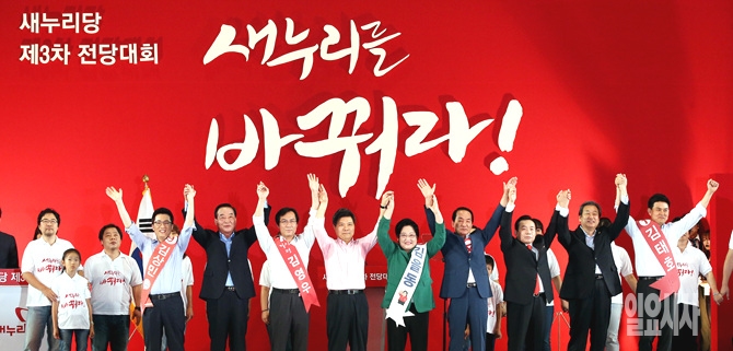 14일 오후, 서울 송파구 잠실실내체육관에서 새누리당 당 대표와 최고위원을 선출하는 7·14전당대회가 열린 가운데, 출마자들이 단상에 올라 손을 맞잡고 있다.
