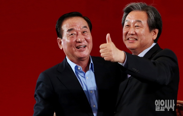 14일 서울 송파구 잠실실내체육관에서 열린 새누리당 대표최고위원 및 최고위원 선출을 위한 전당대회에서 당대표로 선출된 김무성 의원(오른쪽)이 2위로 최고위원에 선출된 서청원 의원과 엄지손가락을 치켜세우고 있다.