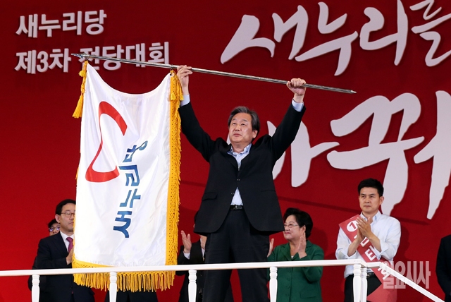 14일 서울 송파구 잠실실내체육관에서 열린 새누리당 대표최고위원 및 최고위원 선출을 위한 전당대회에서 당대표로 선출된 김무성 의원이 당기를 들어보이고 있다.