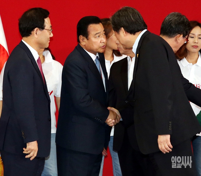 14일 오후, 서울 송파구 잠실실내체육관에서 열린 새누리당 7·14 전당대회에서 김무성 후보가 신임 대표를 확정지은 뒤 이완구 비대위원장 겸 원내대표와 악수를 나누고 있다.