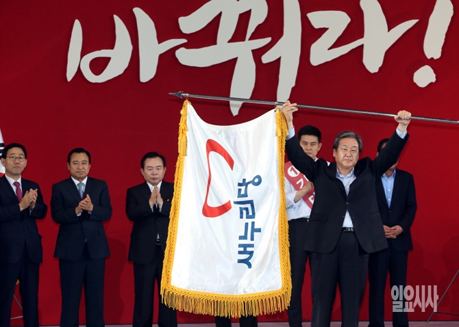 14일 오후, 서울 송파구 잠실실내체육관에서 열린 새누리당 7·14 전당대회에서 김무성 후보가 신임 대표로 선출된 직후 당기를 번쩍 들어올리고 있다.