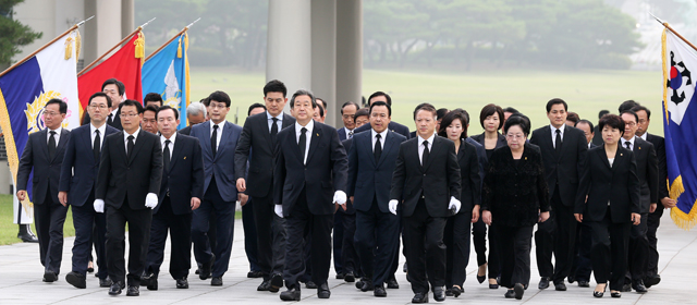 새누리당 김무성 대표와 이완구 원내대표를 비롯한 의원들이 15일 서울 동작구 국립현충원을 참배하기 위해 들어서고 있다.